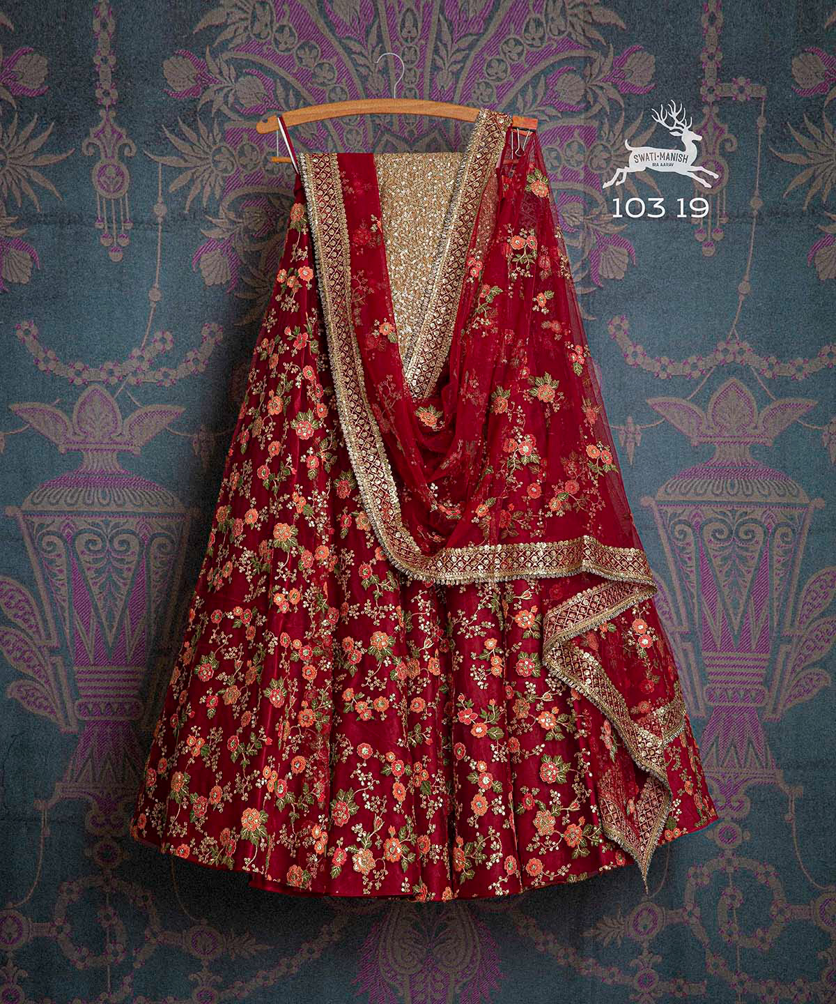 SMF LEH 820 112 | ₹ 49,800 | Red Lehenga with gold thread-work and sequin with net sequin dupatta and net thread-work sequin blouse (2 Pieces Available)