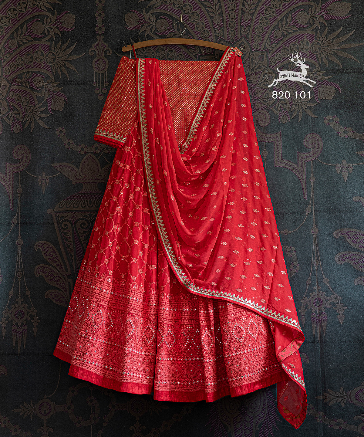 SMF LEH 820 101 | ₹ 38,800 | Red threadwork sequin, art georgette Lehenga and dupatta with matching blouse