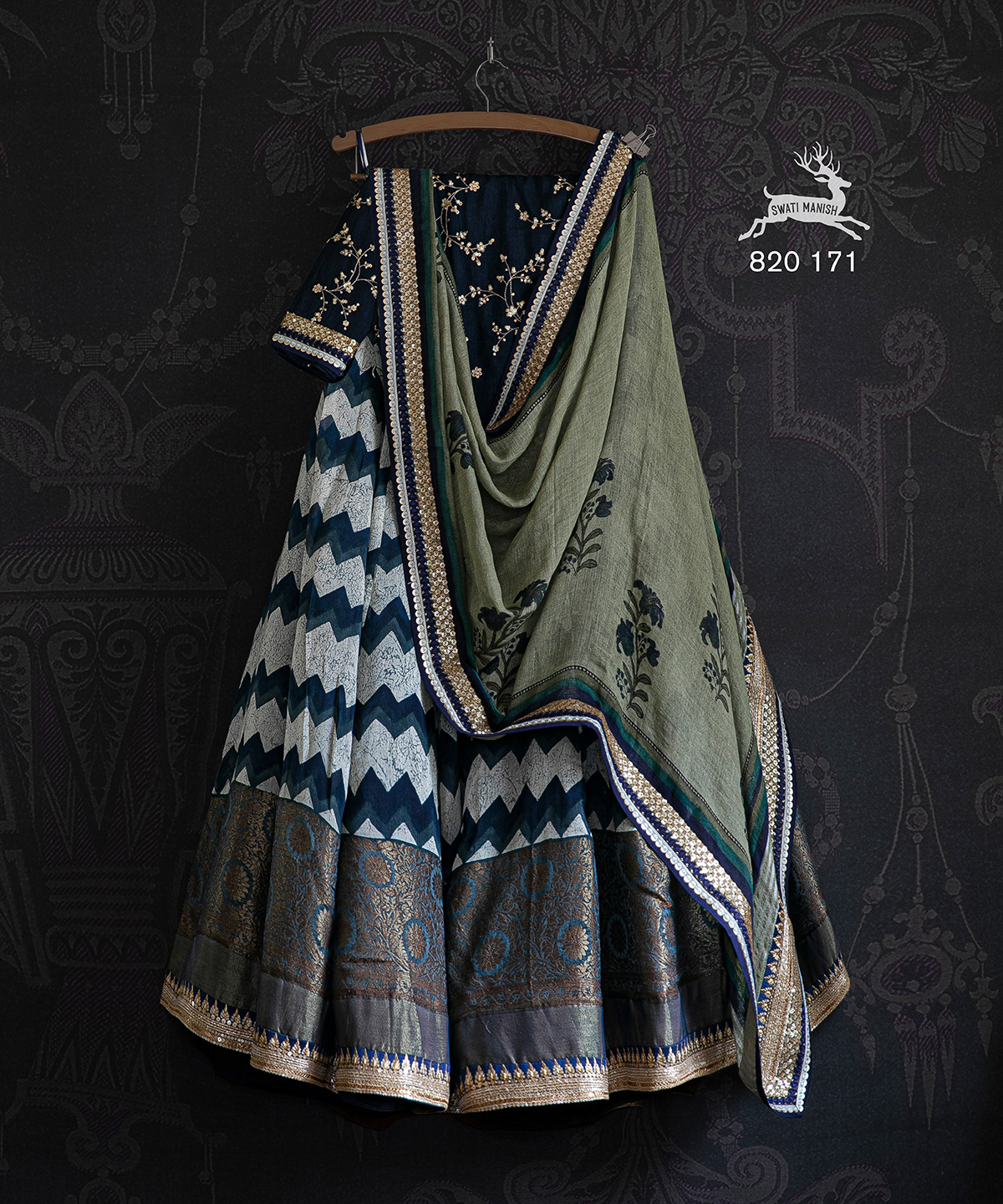 SMF LEH 820 171 | Blue and white chanderi Lehenga with beige green cotton-jute dupatta with midnight blue thread-work sequin blouse